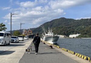 食べたら目の前の海で犬達のお散歩。