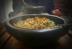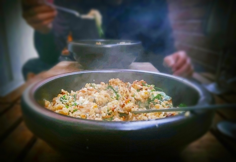 石焼ビビンバ鍋を熱して、ご飯と具を入れたら生卵をのせてごま油を一周。ジュワーーーーーーッ!と音がしたら完成。