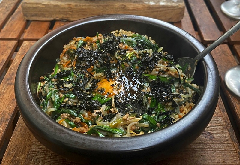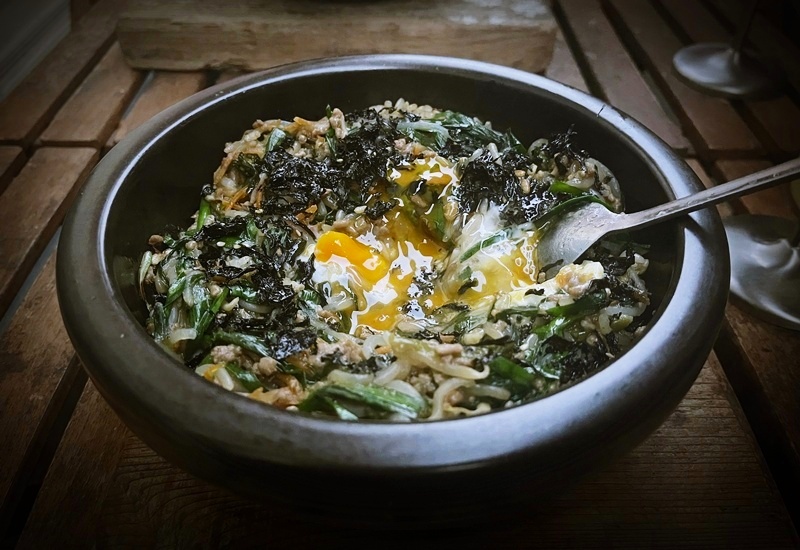 石焼ビビンバ鍋を熱して、ご飯と具を入れたら生卵をのせてごま油を一周。ジュワーーーーーーッ!と音がしたら完成。