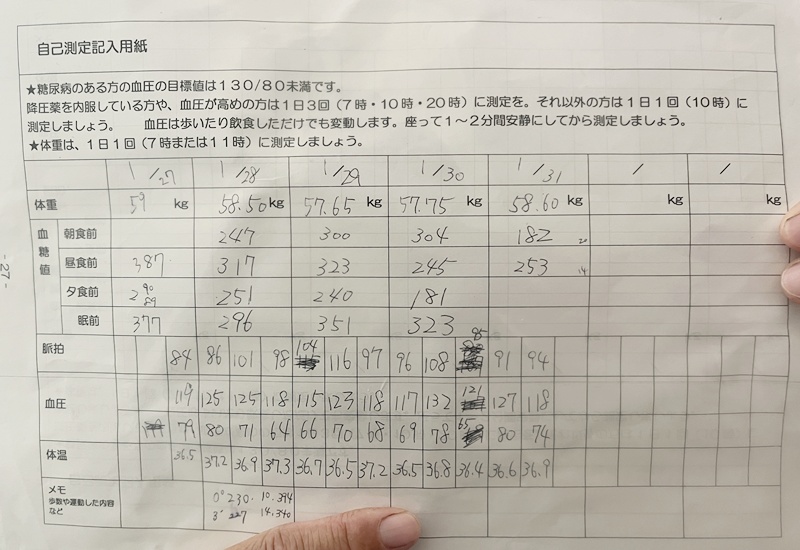 家に帰っても毎日、体重と血圧と血糖値を測らんといけんのよ。