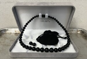 幼いころからエリザベス女王が好きで、気付いた時にはイギリス王室と日本の皇室のファンになっていました。エリザベス女王国葬の際に雅子様がジェット(黒い宝石)のネックレスとイヤリングをつけているのを見て私もジェットが欲しくなりました。そもそもジェットって何?なのですが、1億8000万年前の木が海底で化石化したものです。もうあまり採れなくなってきているので貴重です。165年前の事です。イギリスのビクトリア女王が夫を亡くした悲しみから、ずっと喪服で過ごしていました。その喪服にあせていたのがジェットです。女王が「私に会いたい人はジェットを身に付けるように」と言ったのをきっかけにジェットブームが起きました。そこでジェットがモーニングジュエリー(喪に服すジュエリー)と定められ、皇室も喪服にジェットをあわせるようになりました。王室皇室ファンの私としては、限りあるジェットを今のうちにゲットしておきたい!と思いました。しかし安っぽいものは嫌だし、かといって高級な品は身に着けるのも扱うのも疲れます。今の私にちょうど良いものを・・・と調べて数か月、ようやく身の丈にあったジェットを手に入れました。