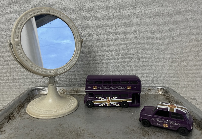 アクセサリーボックスの上には、エリザベス女王生誕90年記念で発売されたCorgiのクラシックミニとバスを並べています。鏡は35年物のイタリアヴィンテージです。どれもそんなに高いものではないけれど、好きなものしか持っていない状況が心地良いです。